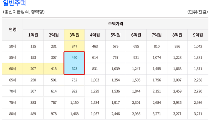 <가정> 주택가격 : 3억 원(55세부터 60세까지 주택가격 변동 없음)