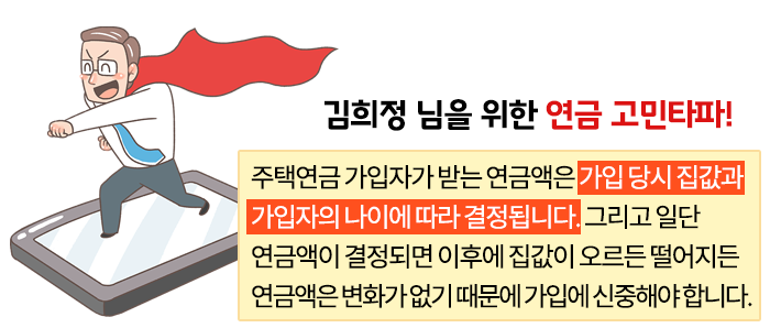 그런데 집값 등락과 무관하게 가입 당시 정해진 연금액을 수령하면, 집값이 내려갔을 때야 득이 되겠지만 올랐을 때는 불만이 생길 수밖에 없을 겁니다.