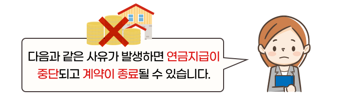 주택연금의 장점 중 하나는 종신방식을 선택하면, 박민우 님과 배우자, 두 분이 모두가 사망할 때까지 월 지급금을 수령할 수 있다는 점입니다. 하지만 종신방식을 선택했다고 하더라도, 다음 몇 가지 사유가 발생할 경우에 연금지급이 중단되고 계약이 종료될 수 있습니다.