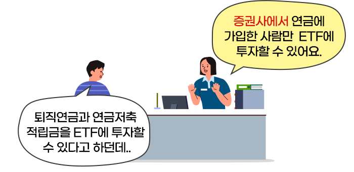 퇴직연금과 연금저축 적립금을 ETF에 투자할 수는 있다고는 하지만, 모든 금융회사에서 ETF 거래가 가능한 것은 아닙니다. 거래소에서 주식처럼 거래되는 ETF의 특성상 증권사에서 연금에 가입한 사람만 ETF에 투자할 수 있습니다.