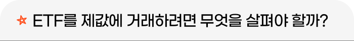 ETF를 제값에 거래하려면 기준가격으로 사고팔면 됩니다. 하지만 실제 거래가 매번 정확하게 기준가격에 맞춰 이뤄질 수는 없습니다. 때로는 기준가격보다 비싸게 할증거래 되기도 하고, 싸게 할인거래 될 때도 있습니다.