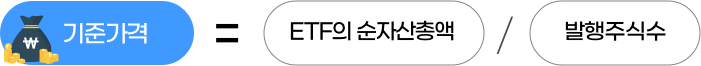 ETF 거래는 좌수 단위로 하고, 한 좌당 순자산가치를 기준가격(NAV)이라고 하는데 이는 ETF의 순자산총액을 발행주식수로 나누어 산출합니다.