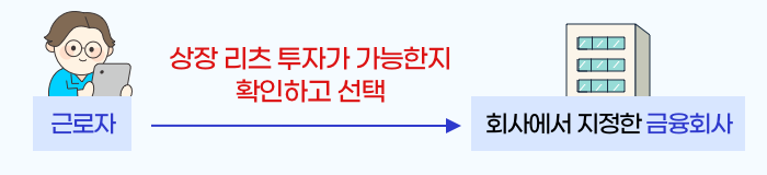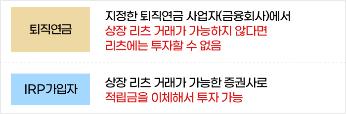 현재 일부 증권사에서 퇴직연금을 상장 리츠에 투자할 수 있도록 서비스를 제공하고 있습니다. 회사에서 지정한 퇴직연금 사업자 중에 그런 증권사가 없다면, 리츠에는 투자할 수 없습니다.