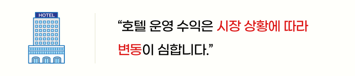 호텔 투자는 임대수입이 아니라 운영수익에서 수입이 발생하기 때문에, 일반 부동산 투자에 비해 까다롭습니다.