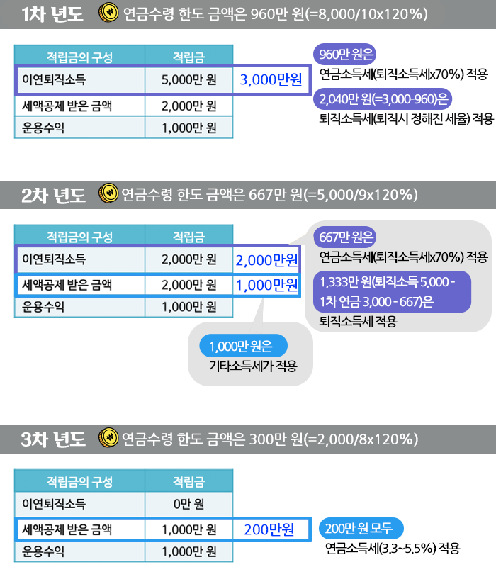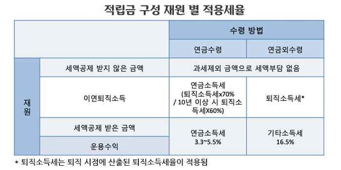 세액공제 받는 않은 금액에 대해선 세액부담이 없으며, 이연퇴직소득은 연금수령 한도에 따라 연금소득세(퇴직소득세의 60~70%) 또는 퇴직소득세를 적용받고, 세액공제 받은 금액과 운용수익은 연금수령 한도에 따라 연금소득세(연령별 3.3~5.5%) 또는 기타소득세를 적용받습니다.