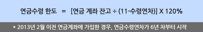 연금수령 한도 공식에서 알 수 있듯이 연금수령은 10년 경과 시 수령한도의 제한이 없어집니다. 즉 연금을 적어도 10년 이상 수령할 것을 권장하고 있는 것입니다.