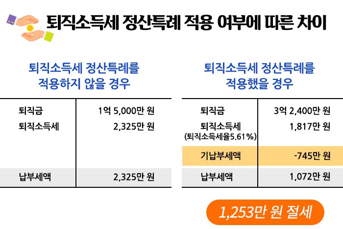 즉 퇴직 시점에 퇴직소득세 정산특례를 신청하지 않으면 2,325만 원을 세금으로 납입했어야 하지만, 정산특례를 신청할 경우에는 1,072만 원만 납입하면 되니 1,253만 원의 세금이 절세되는 것입니다.