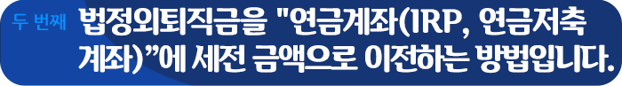 이때 연금계좌는 IRP계좌, 연금저축계좌(개인연금) 모두 가능하며, 가장 좋은 방법은 법정퇴직금과 법정외퇴직금을 서로 다른 연금계좌로 이전하는 것입니다.