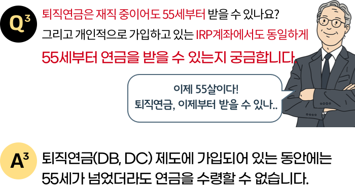 55세부터 반드시 연금을 수령해야 하는 것은 아니며, 55세 이후 본인이 원하는 시점부터 받을 수 있습니다.
