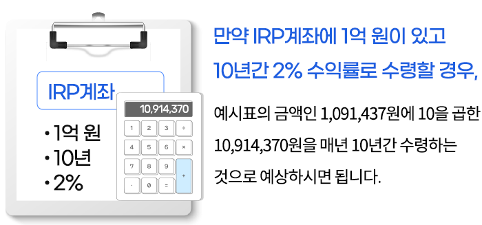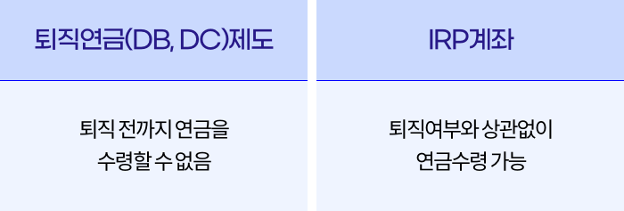 그러나 IRP계좌는 개인계좌이므로, 가입 기간이 5년 넘고, 55세가 되면 퇴직 여부와 상관없이 언제든지 연금수령을 선택하여 받을 수 있습니다.