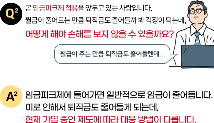확정급여형(DB) 제도에 가입 중인 경우에는 임금피크제로 들어가기 직전 DB 퇴직금을 정산해서 확정기여형(DC) 제도로 이전해야 퇴직금이 줄어들지 않습니다. 만약, 회사에 DC제도가 없다면 DC제도 도입을 요청해야 합니다.