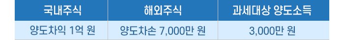 예를 들어, 대주주 종목에서 1억 원 양도차익이 발생하였는데, 해외주식에서 7,000만 원 손실을 보고 있다면?