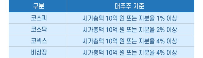 주주가 되는 기준은 세법에서 정하고 있는데 종목별로 아래 기준 이상 주식을 보유한다면 대주주가 되는 것입니다.