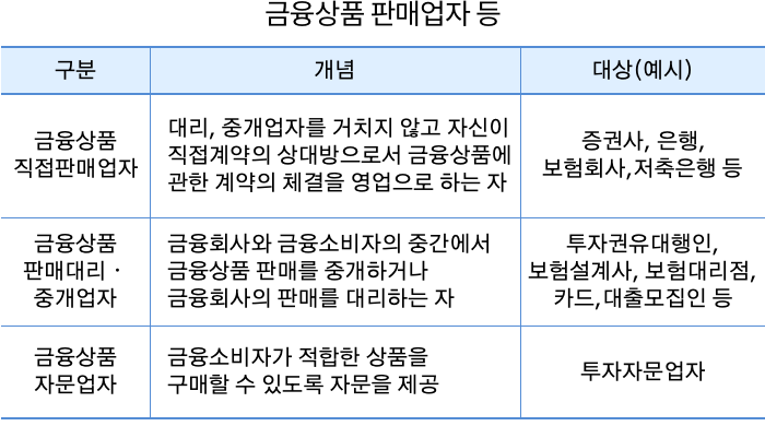 그리고 기존 금융회사ㆍ판매회사도 “금융상품판매업자 등”으로 통칭한 뒤 금융상품 직접판매업자, 금융상품 판매대리ㆍ중개업자, 금융상품 자문업자 이렇게 세 가지 형태로 재분류하여 업종별로 형평에 맞게 적용하였습니다.