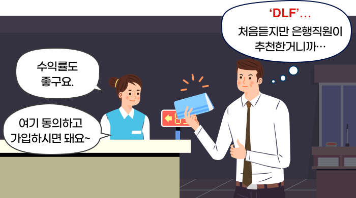‘DLF’ 처음 들어보는 금융상품이었지만 금융회사 직원이 추천한 거고 수익률 또한 좋다고 하니 직원의 말에 따라 모든 내용에 동의를 하고 상품에 가입을 한 거죠.
