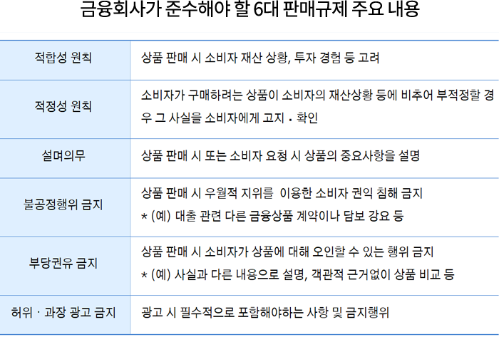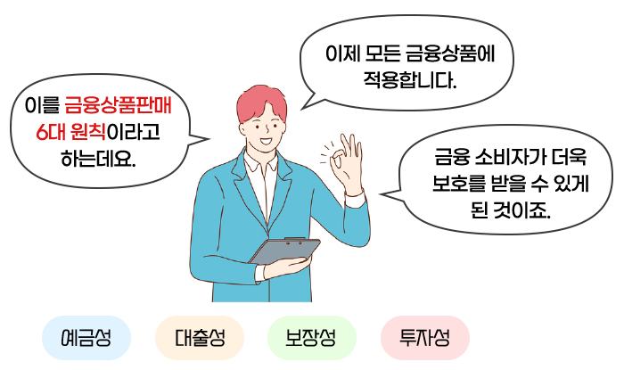금소법에서는 개별업법에서 일부 금융상품(펀드나 변액보험 등)에 한정하여 적용하고 있던 6대 판매원칙을 거의 모든 금융상품에 확대 적용하도록 하였습니다.