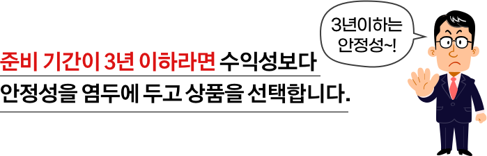 즉, 상대적으로 안정적인 채권형펀드나 정기예금 등을 주로 활용하는 게 좋습니다.