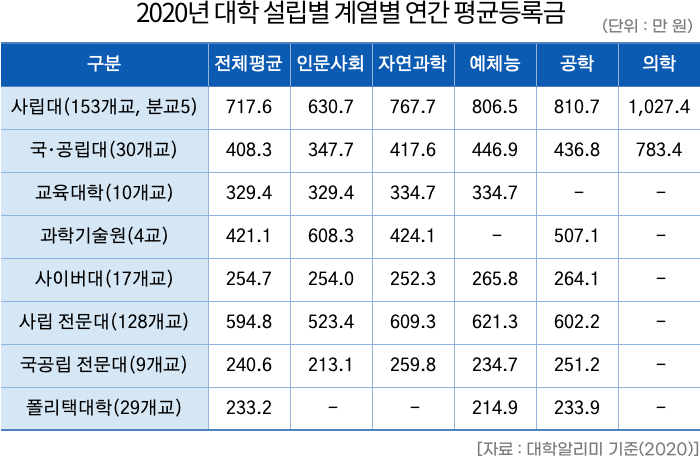 대학 등록금(사립대)은 전공 계열이나 설립별로 차이가 있지만, 연간 717만 원 정도로 조사되었습니다 (2020).