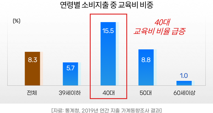 통계청 자료(2019)에 따르면 가구당 월평균 소비지출에서 교육비가 차지하는 비중은 전체 평균 8.3%인데 비해, 40대는 15.5%로 교육비의 비율이 급증하는 시기라고 합니다.