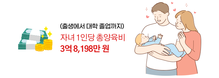 동아일보에서 발표한 ‘요람에서 대학까지: 2019년 대한민국 양육비 계산기’에 따르면 출생에서 대학 졸업까지 자녀 1인당 총양육비는 3억 8,198만 원인 것으로 집계되었습니다.