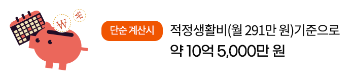 NH100세시대연구소의 2019년 조사에 따르면 노후생활 기간을 30년으로 가정하여 단순하게 계산했을 때 적정생활비(월 291만 원) 기준으로 약 10억 5,000만 원이 필요하다고 합니다.