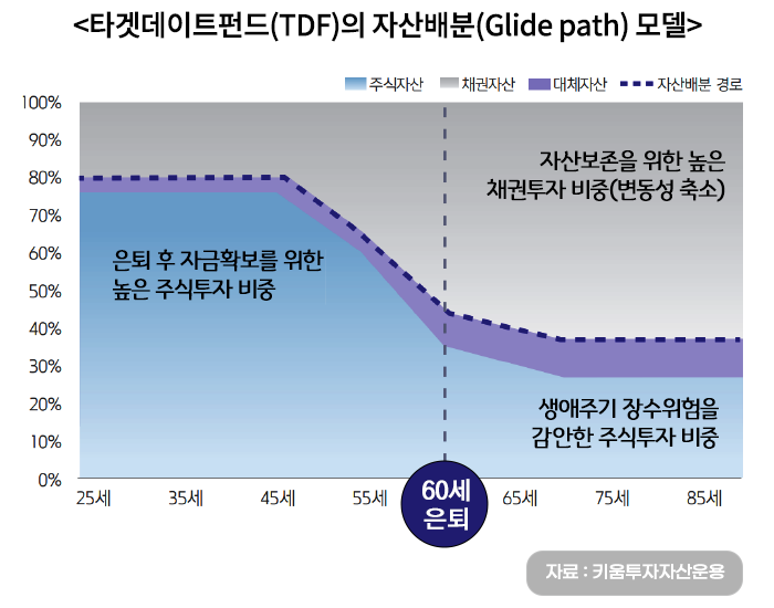 이는 젊을수록 주식과 같은 위험자산의 비중을 높여서 효율적으로 노후준비를 하고, 퇴직에 가까울수록 안전자산의 비중을 높여서 안정적으로 노후자산을 지킬 수 있도록 하는 효과가 있습니다.
