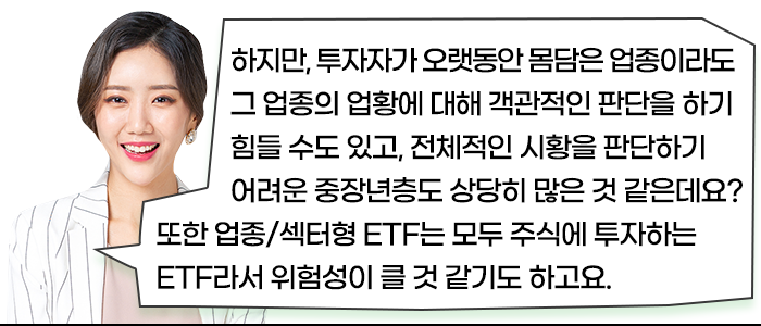 그래서 본인이 가장 잘 알고 있는 업종이나 섹터에 투자하는 ETF에 가입하는 것이 어떨까요?