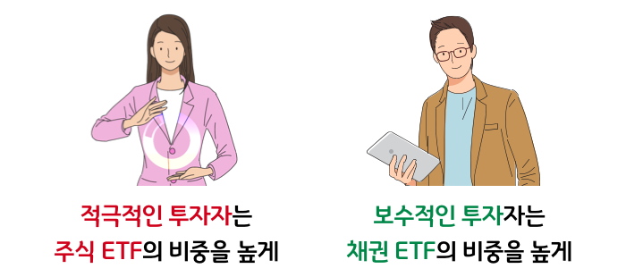 적극적인 투자자는 상대적으로 수익률이 낮은 채권 ETF보다는 주식 ETF의 비중을 높게 설정하고, 보수적인 투자자는 상대적으로 위험성이 높은 주식 ETF보다는 채권 ETF의 비중을 높게 설정하는 것이 바람직할 것입니다.