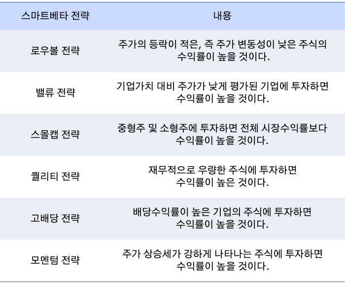 일반적으로 스마트베타 전략은 초과수익률을 달성하기 위한 방법에 따라 분류되는데 다음 표에 설명된 6가지 전략들이 대표적인 스마트베타 전략입니다.