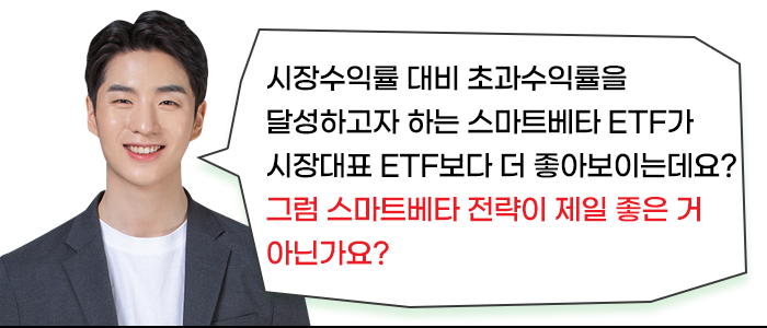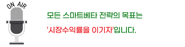 시황에 따라서 스마트베타 전략이 시장수익률을 이기는 경우도 있지만, 어느 전략이 유효한지는 결과론적으로만 검증될 뿐이지 그 예상이 항상 맞아떨어지지는 않기 때문이죠.