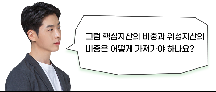초과수익을 달성하기 원하는 공격적 투자성향의 투자자는 핵심자산 50% / 위성자산 50%의 포트폴리오를 구성할 것이고, 시장수익률만큼의 수익률 달성이 목표인 투자자의 경우에는 핵심자산의 비중이 거의 100%에 달할 것입니다.