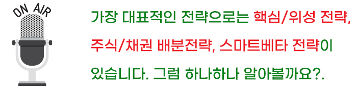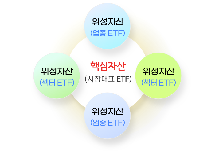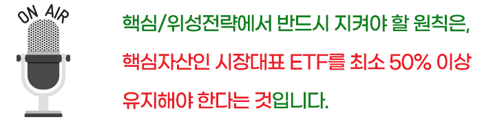 ETF 투자자산의 대부분은 시장대표 ETF에 투자하고(핵심), 일부 자산을 업황이 밝을 것으로 예상되는 업종 ETF나 섹터 ETF에 투자하는 전략(위성)입니다.