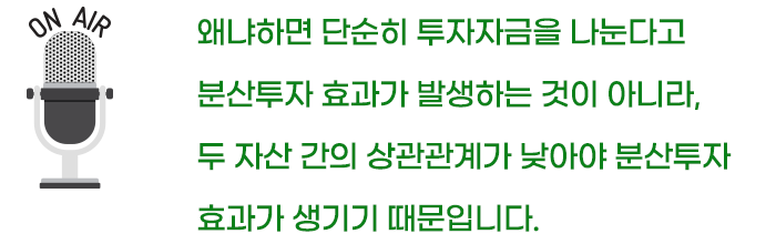 좀 전문적으로 표현하면 ‘상관계수’로 측정하는데요, 이 상관계수가 낮으면 낮을수록 서로 다른 방향으로 움직이는 보완관계가 확실해집니다.