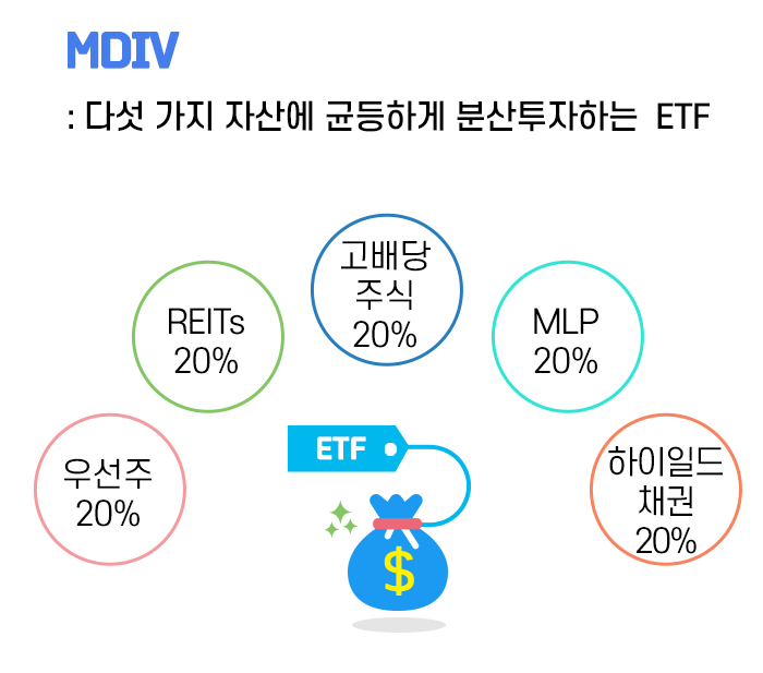 MDIV ETF는 다섯 가지 자산에 균등한 비중으로 분산투자 하는 특징을 가지고 있는 ETF입니다.