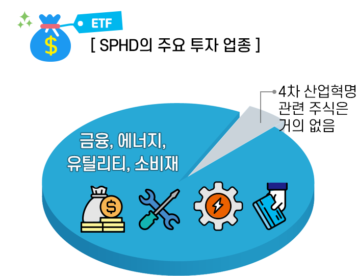 SPHD는 아무래도 배당을 많이 주는 주식들로 편입하다 보니 부동산에 투자한 REITs의 비중이 큰 편입니다. REITs 다음으로는 금융관련 주식, 에너지관련 주식, 유틸리티관련 주식, 소비재관련 주식 등을 주로 포함하고 있습니다.