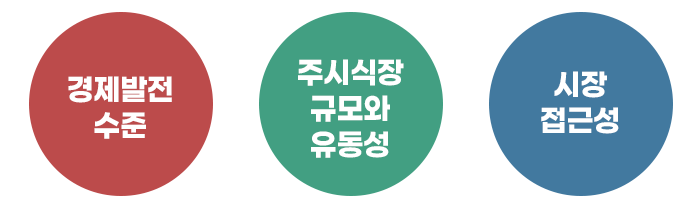 MSCI는 경제발전 수준, 주식시장의 규모와 유동성, 그리고 시장 접근성 등 세 가지 기준으로 편입될 시장을 분류 합니다.
