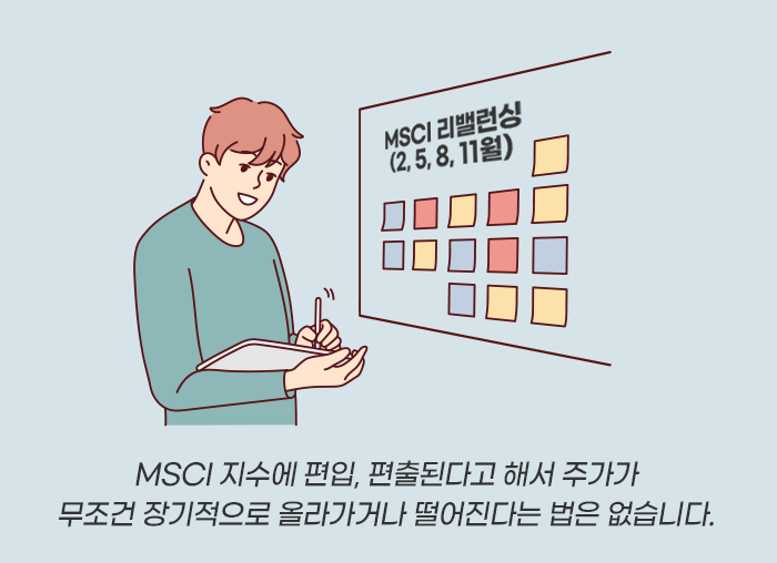 하지만 MSCI 지수에 편입, 편출된다고 해서 주가가 무조건 장기적으로 올라가거나 떨어진다는 법은 없습니다.