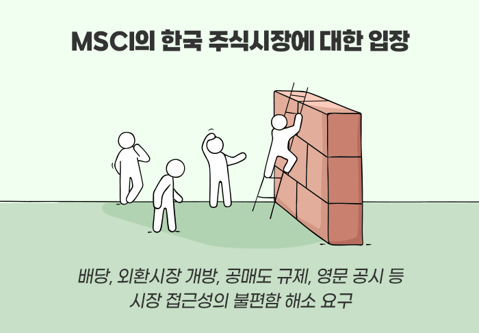 MSCI는 외환시장 개방, 공매도 규제, 영문 공시, 배당 등 외국인 입장에서 한국 주식시장으로의 시장 접근성이 불편 하기 때문에 한국 증시를 선진시장에 편입시키지 못하고 있다고 설명하고 있습니다.
