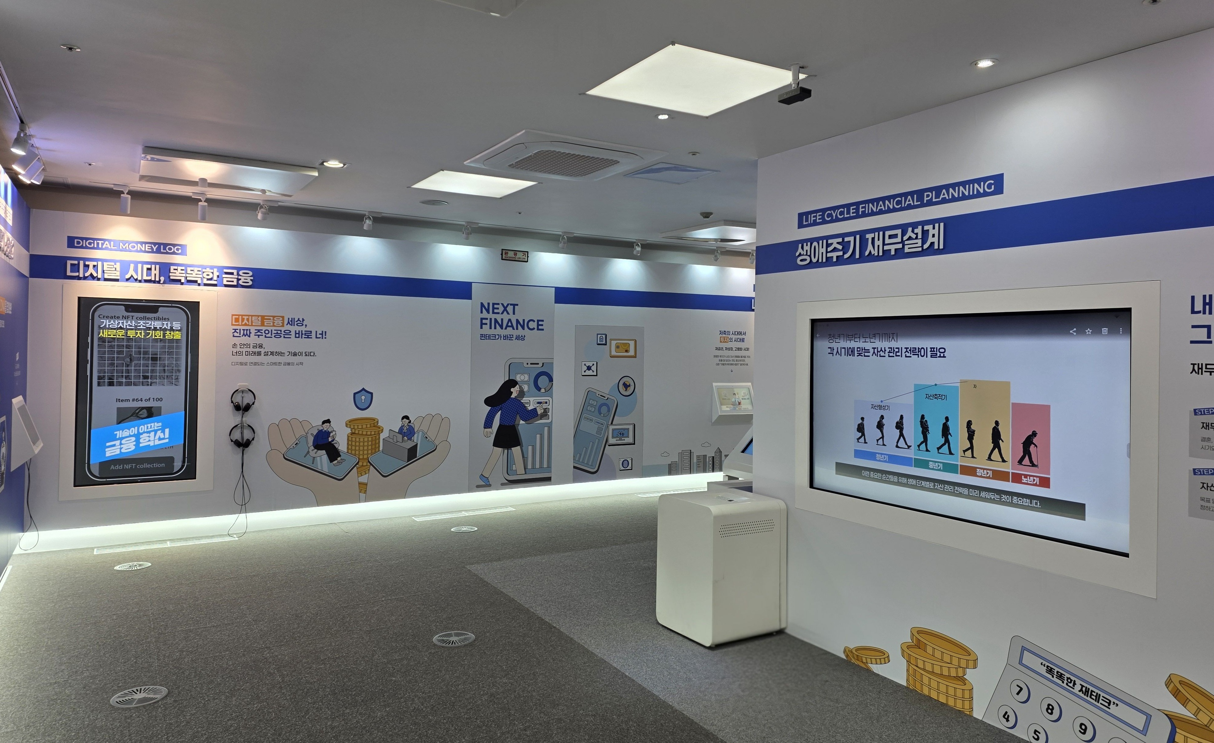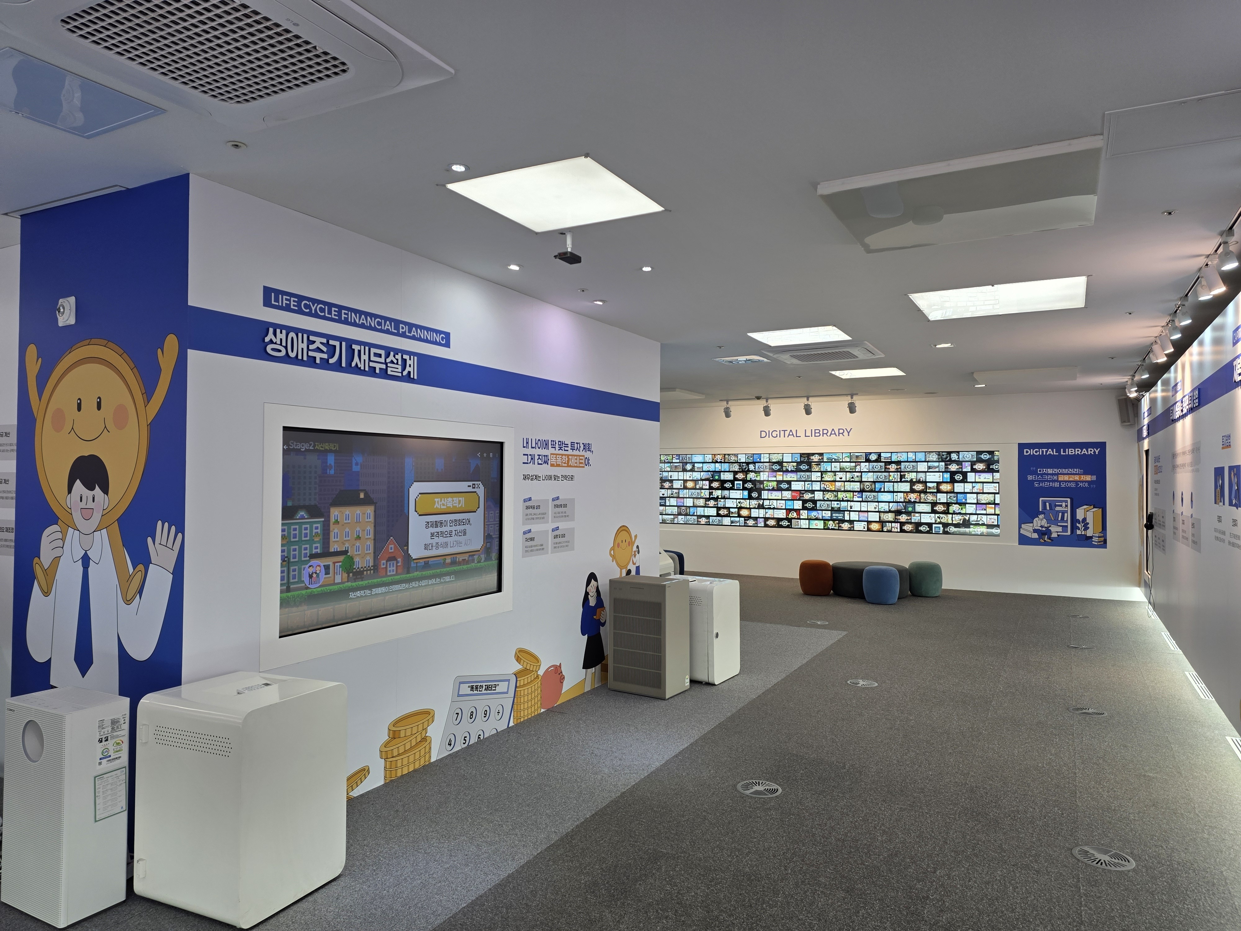 내부 한쪽 벽면을 가득 채운 디지털라이브러리는 그 크기만큼 한눈에 시선을 끌고 있다. 투교협의 대표 금융교육자료들을 멀티스크린에 모아둔 디지털라이브러리는 책을 꺼내 보는 것처럼 관심 있는 콘텐츠를 클릭하면 큰 화면에서 내용을 볼 수 있게 해주는데, 동영상, 웹툰, 웹북 등의 다양한 형태의 콘텐츠들로 구성되어 방문객들의 만족도를 높여 준다.