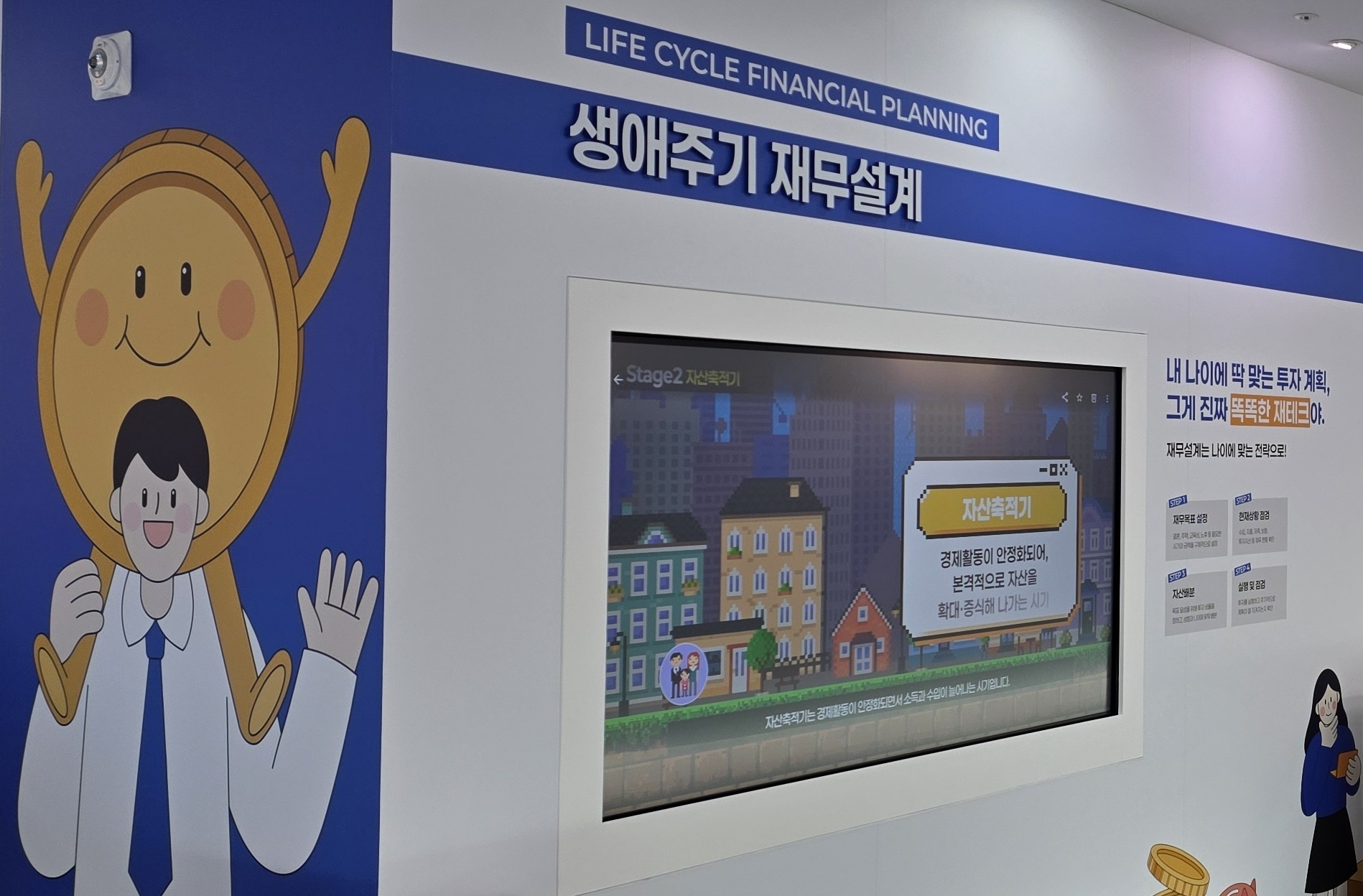 생애주기 재무설계 과정을 레트로 게임 스타일의 그래픽으로 표현하여 몰입도를 높였고, 주 방문객이 청소년인 만큼 금융투자산업에 종사하는 전문가를 소개하는 코너와 금융사기 예방 콘텐츠도 만나볼 수 있다.