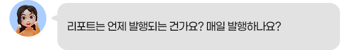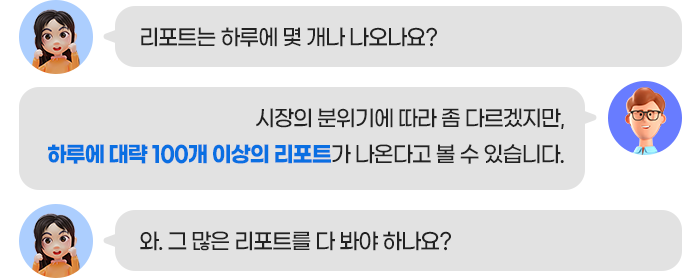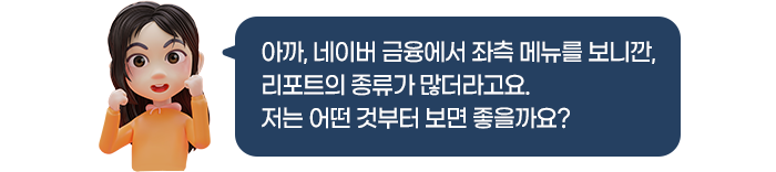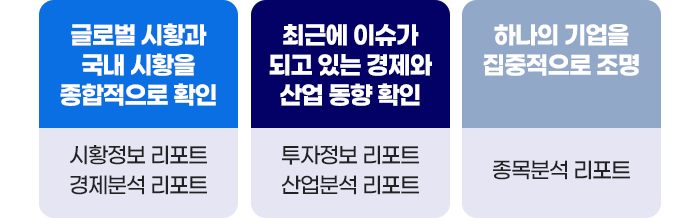 먼저, 각 리포트의 성격을 말씀드리겠습니다. 글로벌 시황과 국내 시황을 종합적으로 확인할 수 있는 ‘시황정보 리포트’와 ‘경제분석 리포트’, 최근에 이슈가 되고 있는 경제와 산업 동향을 확인할 수 있는 ‘투자정보 리포트’와 ‘산업분석 리포트’, 기업을 집중적으로 조명하는 ‘종목분석 리포트’가 있습니다.