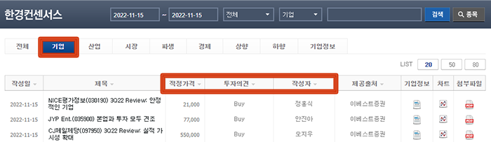 조금 전 봤던 [네이버 금융]과 화면이 다르지요? 한경컨센서스에서 ‘기업’ 리포트를 볼 수 있는 화면입니다. 말씀드렸던 편리한 점 외에도 애널리스트의 이름도 확인할 수 가 있습니다.