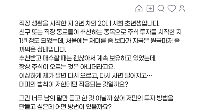 실제 투자를 하는 분들 중에 지인의 추천으로 시작하시는 분들이 많습니다. 하지만, 얼마나 보유해야 할지, 목표 주가는 얼마인지, 종목의 특성이 무엇인지는 잘 몰라서 낭패를 보는 경우도 종종 있는데요.