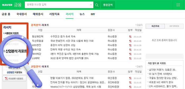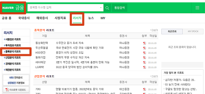 첫 번째 방법은 [네이버 금융]내의 [리서치]를 확인하는 것입니다. 시황정보, 투자정보, 종목분석, 산업분석, 경제분석, 채권분석 등 다양한 리포트를 볼 수 있습니다.