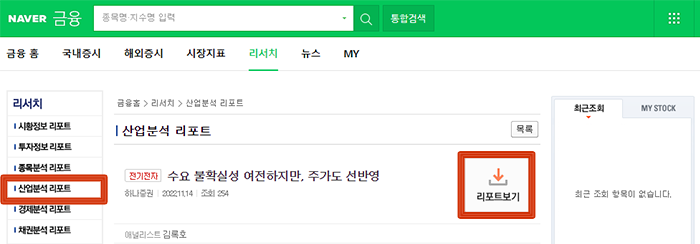 ● 네이버 금융 〉 리서치 〉 산업분석 리포트