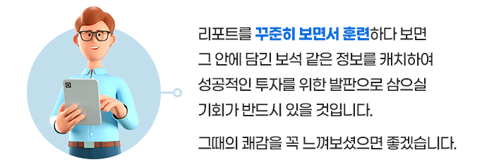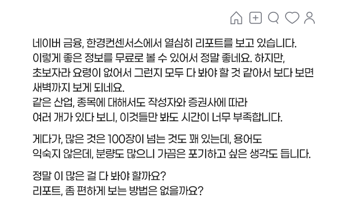 하루에도 많게는 100여 개가 넘는 리포트가 나오는 데다, 그 분량도 만만치 않으니 이제 막 리포트를 보기 시작하시는 분들은 쉽게 지칠 수 있습니다. 꾸준히 리포트를 보는 습관을 키우면 본인만의 방법을 만들 수 있겠지만, 그 과정이 쉽지는 않겠지요?