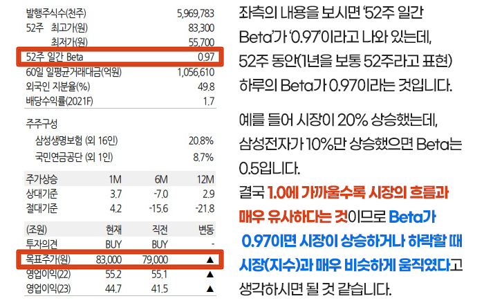 첫 페이지에서 확인해 볼 두 번째 부분은 ‘52주 일간 Beta’라는 항목입니다. 베타값은 개별주식의 수익률이 시장수익률의 변동에 얼마나 민감하게 반응하는가를 나타내는 수치입니다. 본인이 투자하려는 종목이 경기 변화에 민감한 업종인지를 알고 싶다면, 이를 잘 활용해보시면 좋습니다.