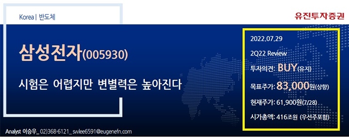 노란색 네모 안의 내용을 하나씩 살펴보면, 리포트를 발간한 날짜가 맨 위에 있습니다. 그리고 그 아래 ‘2Q22 Review’는 2분기 실적을 리뷰한 리포트라는 것을 알 수가 있습니다.