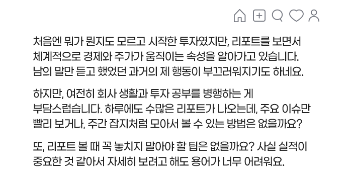리포트를 읽는 것이 투자에 도움이 된다는 것을 알겠는데, 그렇게 많은 시간을 투자할 수 있는 개인투자자는 많지 않습니다.