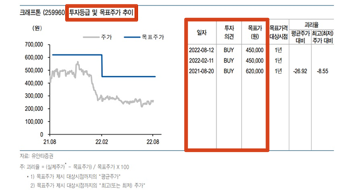 목표주가와 현재 주가의 차이를 괴리율로 표현하고는 하는데 그보다 더 중요한 것은 해당 리포트를 작성한 애널리스트가 제시한 목표주가의 추이가 더 중요합니다. 변화 추이를 참고하는 것이 더 신뢰할 만하다는 것이지요.